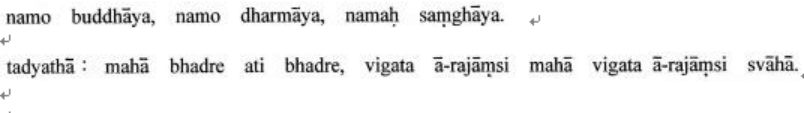 那(上)谟菩(上)陀夜那(上)谟驮啰(上)磨夜那(上)谟僧伽夜 跢(丁可反)侄他 磨(上)诃婆(上)跌[口*(黍-禾+利)]阿(上)底(都你反)婆(上)跌[口*(黍-禾+利)]鼻(上)伽(上)哆曷啰阇西磨诃鼻(上)伽(上)多曷啰阇西娑(上)婆诃