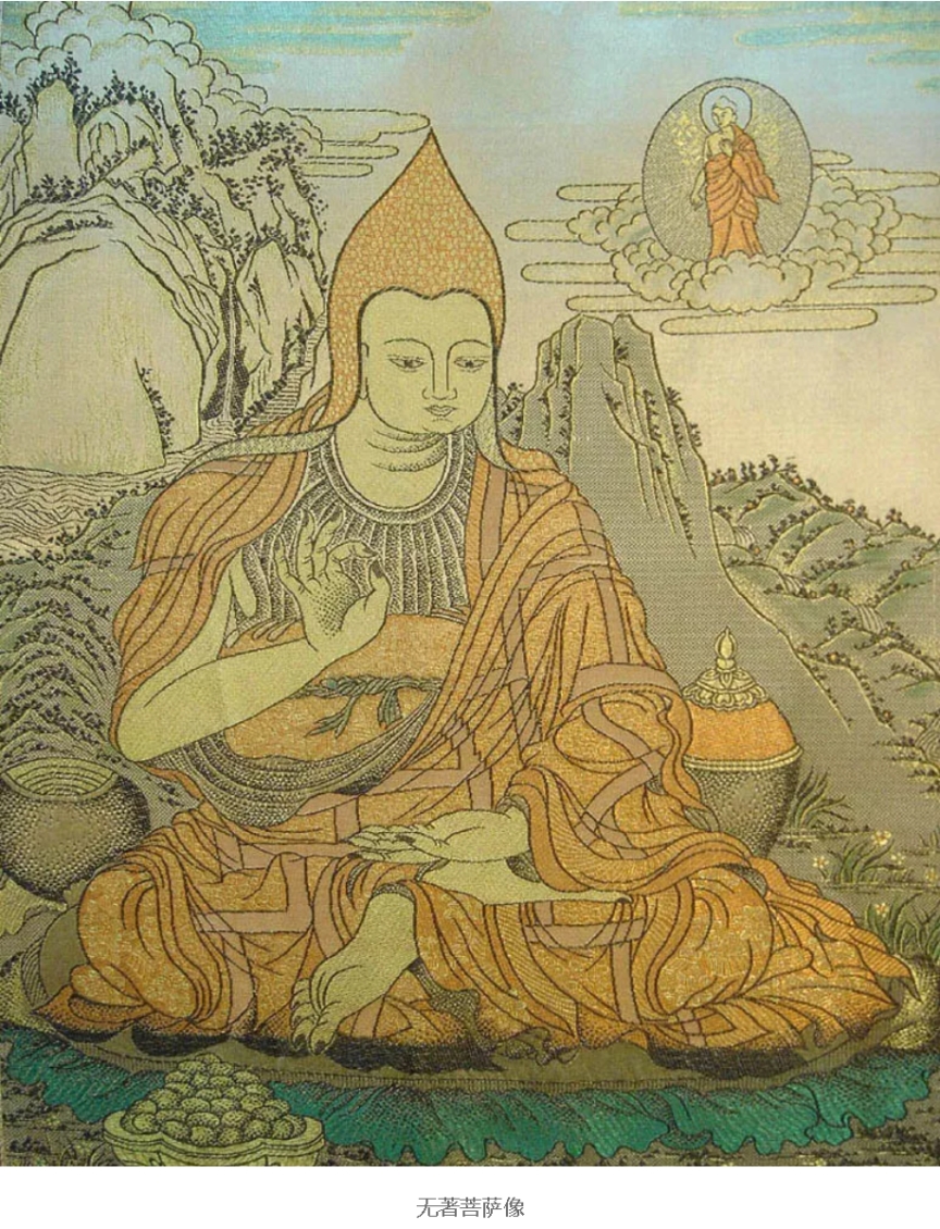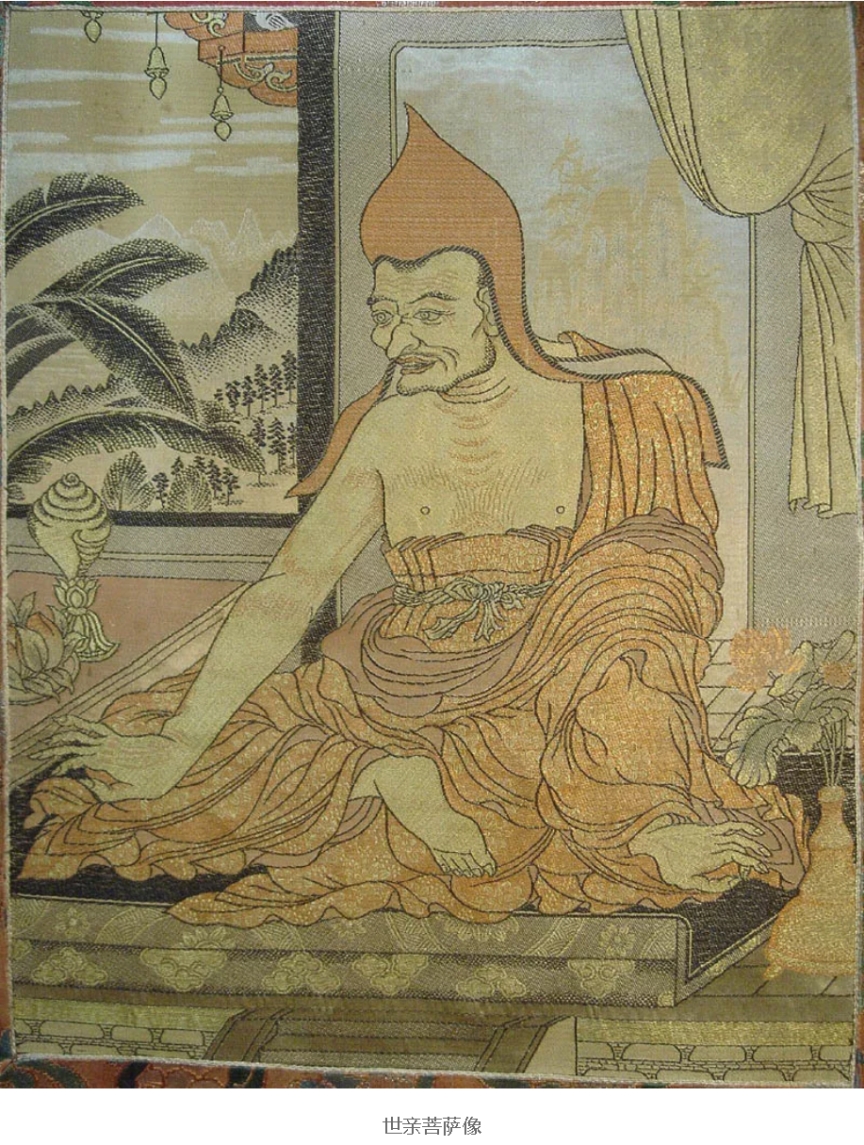 距今一千六百年前,北印度丈夫国有婆罗门姓憍尸迦者,身为国师,生三子,皆从小乘有部出家。伯子后作大乘空观有契,特名无著;季子早证阿罗汉果;仲子喜究小乘论,特名世亲(或译天亲)。无著具大根性,初修“离欲定”有得,而思维生空之义不能入,欲自杀身。时宾头卢尊者在东胜神洲演化,以天眼观见而愍之。即从东洲来,为说小乘空观之旨,遂见道。然意犹未足,理应有更深者。以禅定力乘神通上升兜率天,谘问弥勒菩萨,得闻大乘空观之道。还阎浮提,如说思维,大悟,地六种动。从此能无住生心,故有“无著”之名。嗣后数上兜率,广闻弥勒教义。随以所得还为人说(有说:无著尝恳请弥勒菩萨降阎浮提亲演其道),先后叙成《瑜伽师地论》《分别瑜伽论》《大乘庄严经论》《辨中边论》《金刚般若论》五大部。又遵教,修日光三摩地。既成,昔所未解,悉能通达;有所见闻,永忆不忘;于佛所说《华严》等大乘诸经,尽明其义。后乃造大乘诸论,以摄实教要理。《摄大乘论》者,即摄取五大论中之精要而发挥者也。其它尚有《显扬论》《集论》等等。世亲出家后,博学多闻,神思俊朗;戒行清高,迥超群众。尝造《俱舍论》六百偈,击鼓宣令,无能破者,遂为阿输遮国国师。但执小乘为是,不信大乘。时无著住丈夫国,恐其造论破大乘,诈称疾笃,促世亲即来诀别。既相见,遽以大乘之道晓之。世亲始悟小乘确非究竟,遂欲断舌忏悔。无著云:“纵断千舌,亦不能灭汝谤法之罪。何不仍借此舌弘扬大乘耶?”世亲然之。无著已灭,即继造大乘论,解释《华严》《涅槃》《法华》《般若》《维摩》《胜鬘》等经。复取《摄大乘论》释之。又著唯识诸论、《十地经论》等。印度及余边地学大小乘者,皆以世亲所造为课本;异部及外道论师莫不畏伏。八十而终。(详《世亲传》)