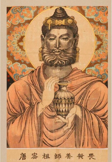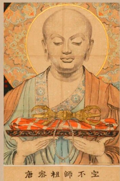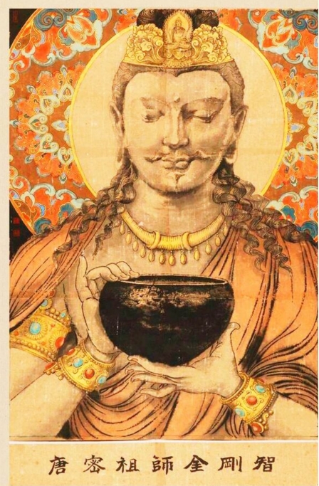 (2)金刚智(梵云跋日罗菩提),南印光明国人。幼年出家,二十受戒。于中印那烂陀寺广学大小乘三藏,兼通中观、瑜伽。三十一岁,往南印礼龙智菩萨为师。经七年承事供养,得受五部灌顶,传承两部大经,诸佛秘密之藏无不精练。尝于作法中感见观自在菩萨现身,证明其学成就,指往东土礼文殊,弘密乘。乃航海而东,三载始达广州。开元八年,乃抵京邑。所住之刹,必建灌顶道场,广度四众。屡为内廷作法,皆大灵验。十一年,从事翻译。未及十载,译出密教经轨数十种。《金刚顶》、《大日》两部念诵法均出大要,其他亦皆密宗鸿宝也。《释教录》只记译籍八种,遗漏殊多耳。二十年,有敕放归本国,行至东都示寂,世寿七十一。不空三藏继承法统,为真言宗第六代阿阇黎。