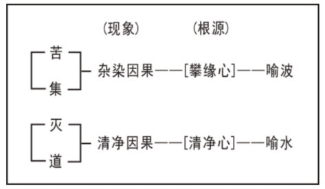 我们作一个总结。整个佛法的因缘观,我们可以简单的分成苦、集、灭、道。佛法认为生命当中有两种相貌:一种是杂染的缘起,一种是清净的缘起,但这两种缘起事实上是有根本的。为什么一个人会触动杂染的因果呢?是因为有攀缘心;为什么有些人能够很快的进去清净安乐庄严的果报呢?因为他找到了真实的清净心,这个就是说你必须在修行当中,先找到你清净的根本。